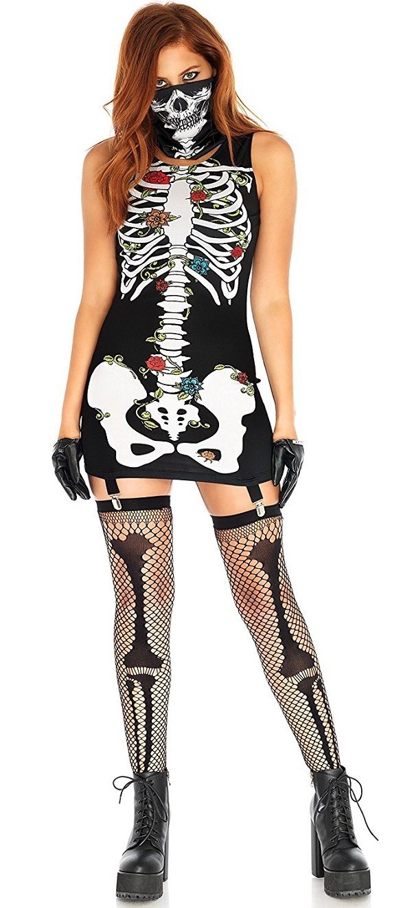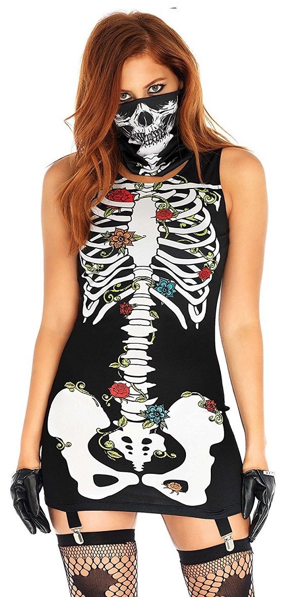 Bones And Roses Costume includes a skeleton garter dress with floral and bone print and a matching face mask.