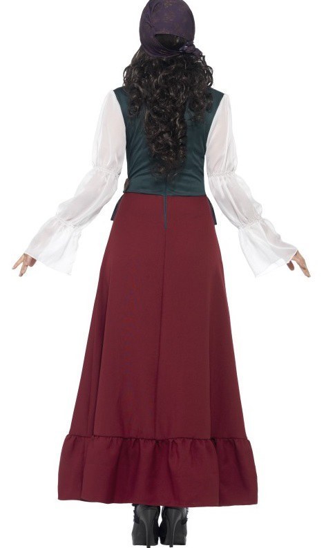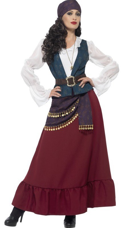Pirate Buccaneer Beauty Costume includes a long dress with a attached shirt and waistcoat. The dress also features a belt and a sash with coin detail.