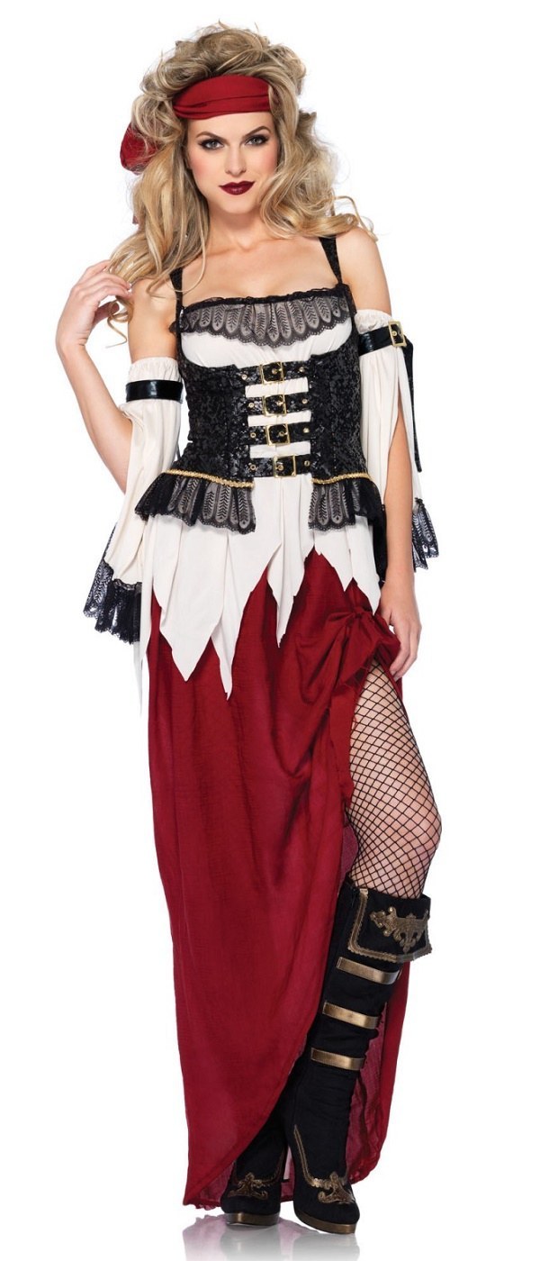 Buried Treasure Beauty Costume includes a long peasant dress with lace trim and a brocade waist cincher with buckle accents. The dress also features split draped sleeves.