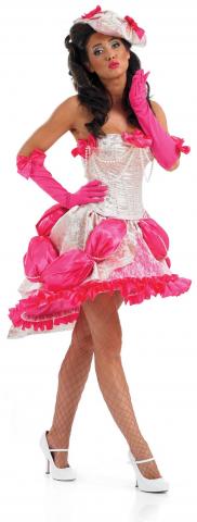 This costume consists of the white strapless bodice with pink bow and white pearl detailing. The skirt is short at the front and longer at the back with pink frill trimming and ruffle on the skirt.