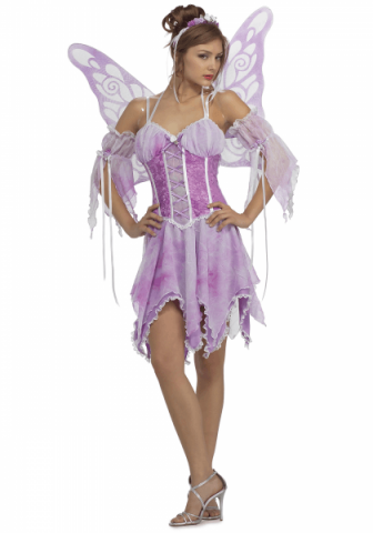 Our pretty Butterfly costume consists of a pink and purple dress with jagged ends and a bodice top with lace and flower detailing. Also included is a pair of sleevelets and a pair of wings.
