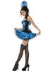 Kick up your legs as a Can Can Sweetie! This 5-piece fancy dress costume comes with a boned velveteen bodice with adjustable shoulder straps for extra support, a frilly blue tulle skirt trimmed in black, barret-clip blue feather headpiece, black velvet bejewelled choker, and a sexy jewelled satin garter.