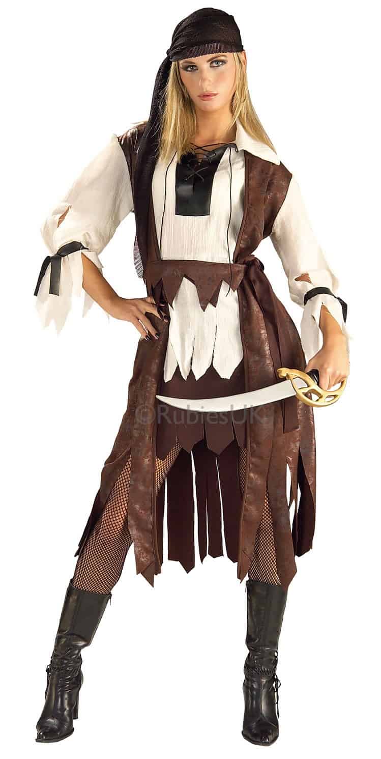 As if torn and tailored from the mainsail, this bonny pirate's garb may be frayed but it's ready for action. What looks like leather appears wrapped around the canvas shirt - looks like this lass helped herself to the Captain's finest coat! Caribbean Pirate Lady Costume Long coat with attached blouse, skirt, waist sash and head scarf.