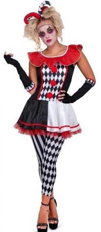 Carnival Jester Costume includes a dress with an oversized collar and a pair of co ordinating leggings. Costume also includes a pair of long gloves.