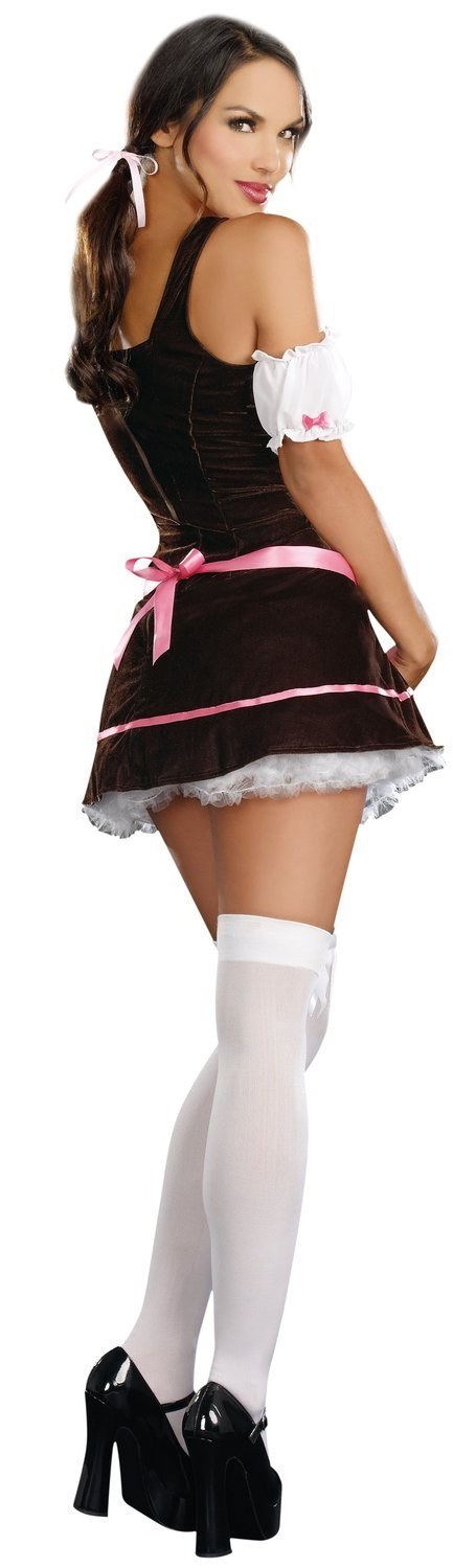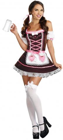 Carrie Me Home Beer Girl Costume includes a brown velour dress with pink trim and a bodice with Bavarian style embroidery. The dress also features and apron wit pockets.