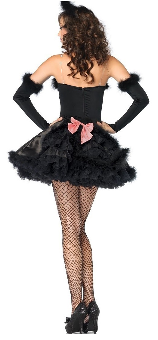 Deluxe Catnap Cutie costume includes a marabou trimmed mini dress with clear removable straps, zipper back, sequin front detail, pink satin bows and trim accents. There is also a ruffle back and pink satin ribbon choker with bell.