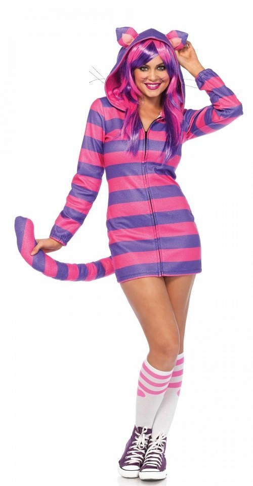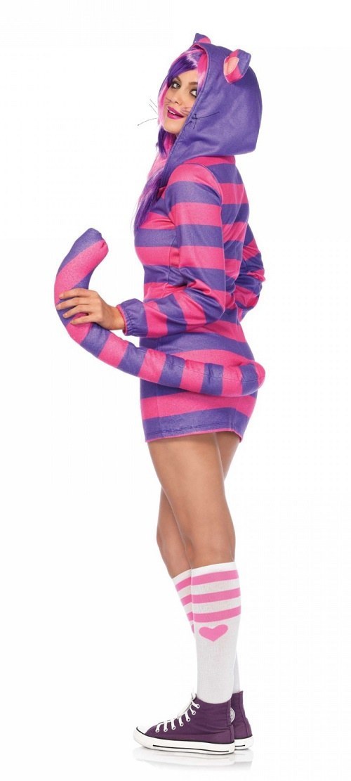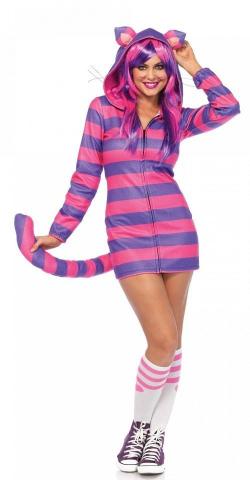 Cozy Cheshire Cat Costume includes a pink and purple stripped zipper front velour dress with a cat ear hood and a tail.