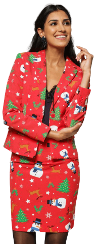 Christmiss Suit includes a colourful printed suit with a matching long sleeved jacket and a skirt.