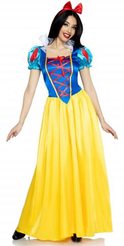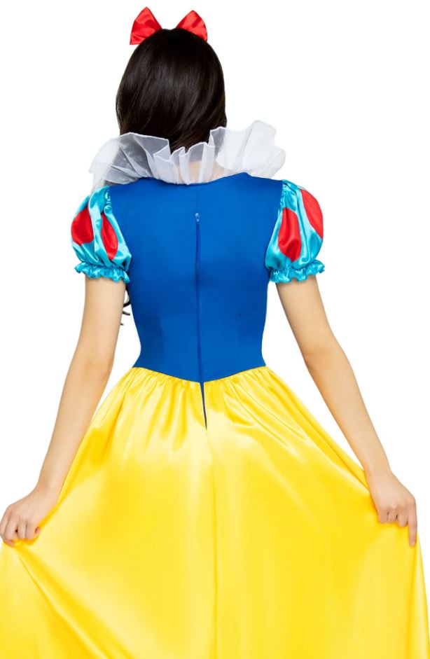 Classic Snow White Costume includes long dress with lace up bodice accent and matching bow headband. Revisit the cartoon days of snow white's first appearance. Accessorise with a poison apple of just have seven boys in tow.