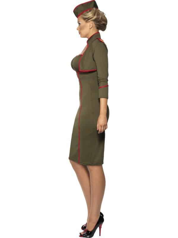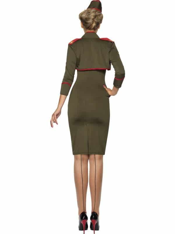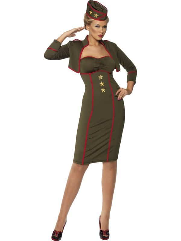 Classy Army Girl Costume includes an army green strapless dress with red trim and three gold stars to the front, a matching mini jacket and a matching hat to complete the look pictured.