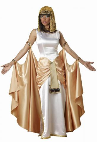 Elite Quality Cleopatra costume consists of a luxury full length satin gown with attached waist sash, gold apron drop, sequin collar, long cape and beaded headpiece.