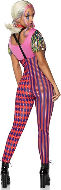The Comic Harlequin Costume includes a curve-hugging spandex catsuit with a front zipper and suspender straps, a playful confetti crop top, and a heart choker that says “trouble never looked this good.”