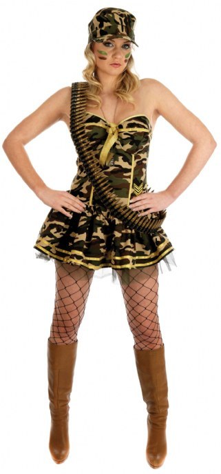 Commando Girl costume includes a camouflage corset style top and a matching skirt with mesh underlay. To complete this military look a matching hat is also included.