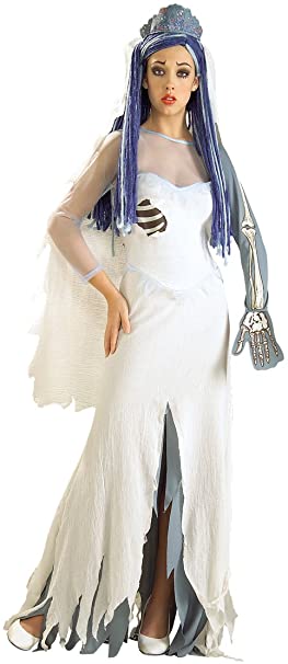 Features a floor-length dress in a blue and grey with distressed looking fabric. The top of the dress includes a patch that shows ribs and one skeletal arm. The head piece is also included, however the wig is available for purchase separately on our site.