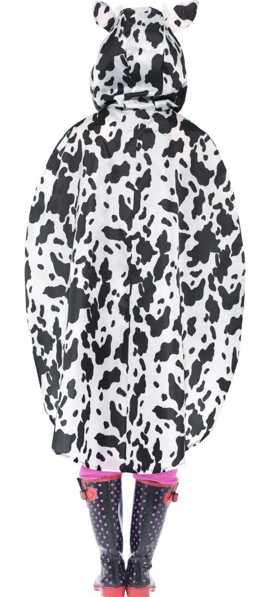 A cow print, shower resistant poncho with drawstring and attached hood, complete with ears.