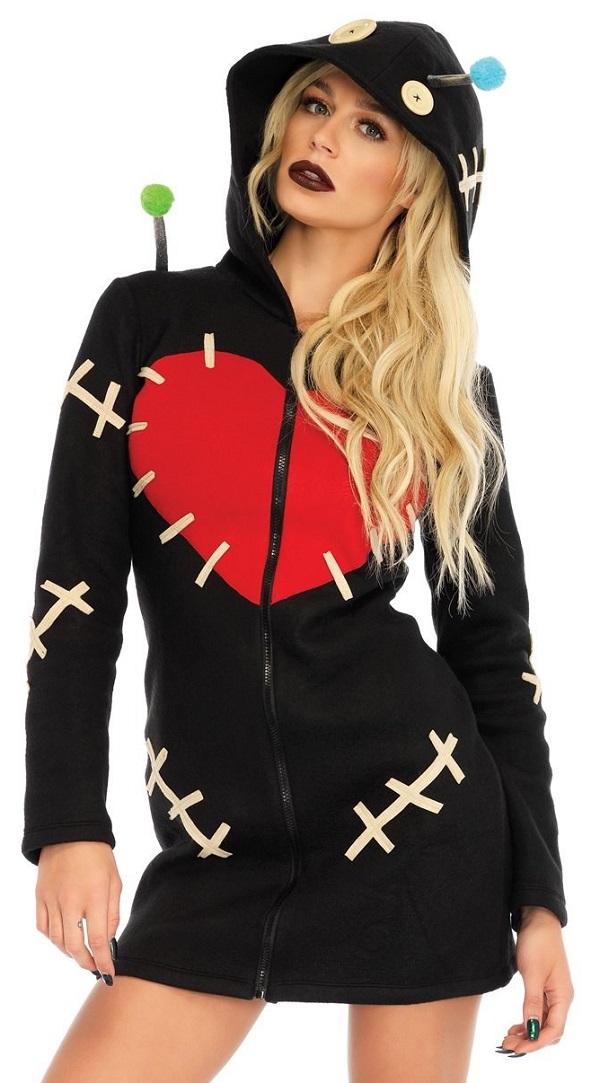 Cozy Voodoo Doll Costume features a zipper front fleece dress with stick pin accents and button eye hood.
