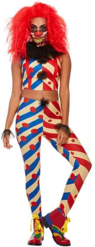 Creepy Clown Costume includes a red & blue top and trousers, mask and neck frills.