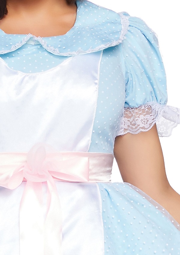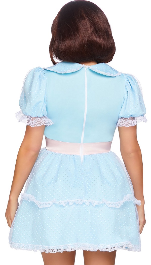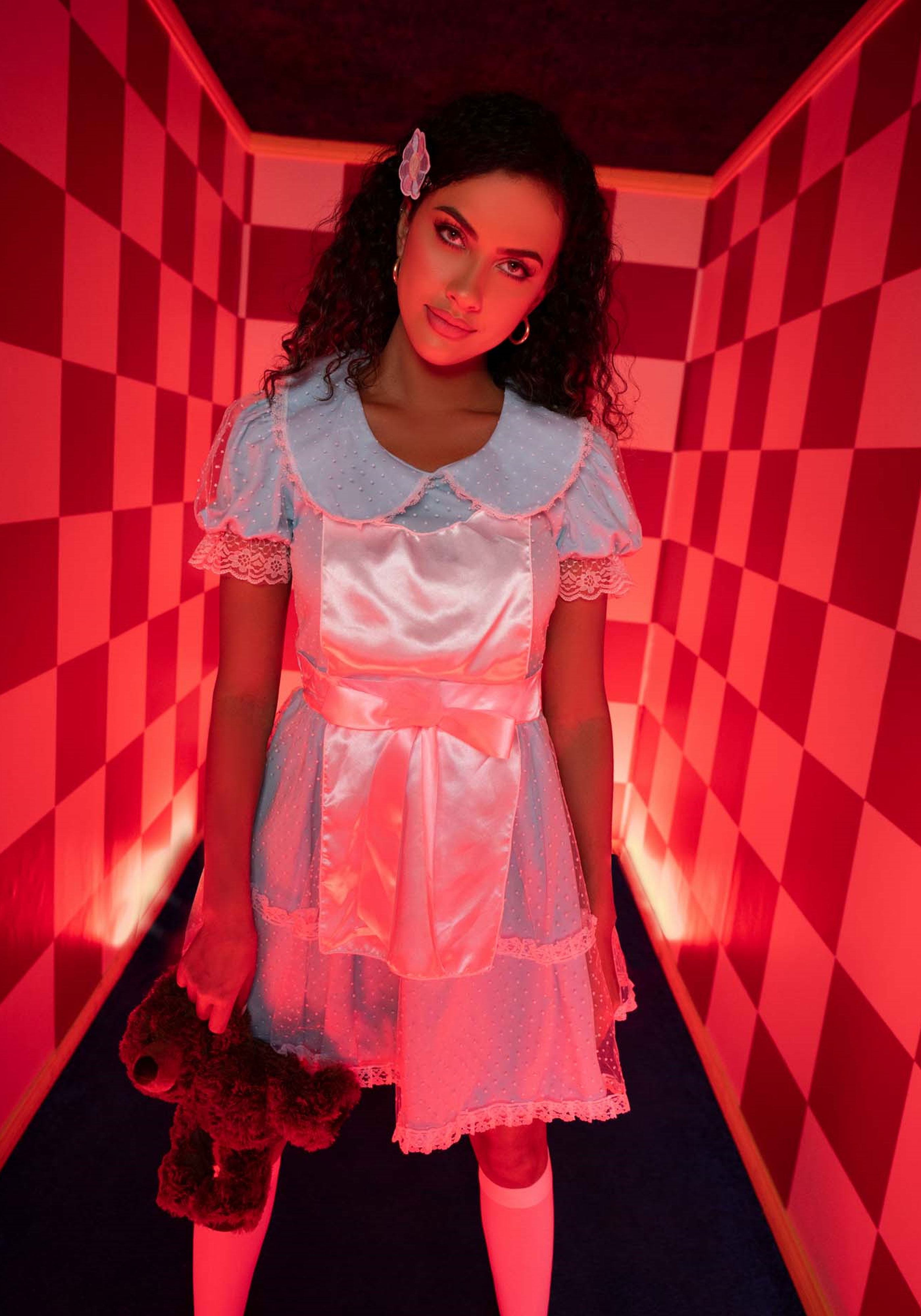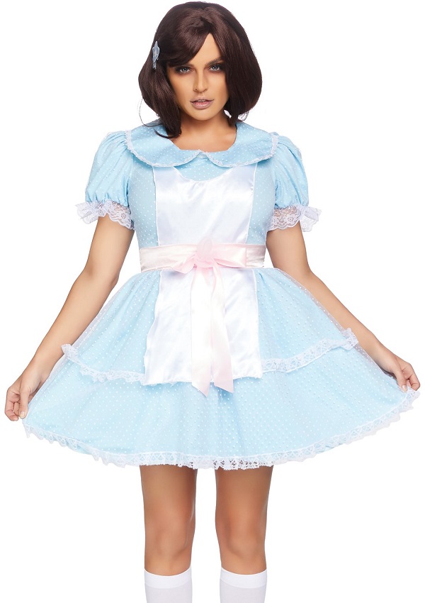 Includes a dotted babydoll dress with an attached pink satin bow sash and a white apron. To complete the creepy look a flower hair clip is also included.