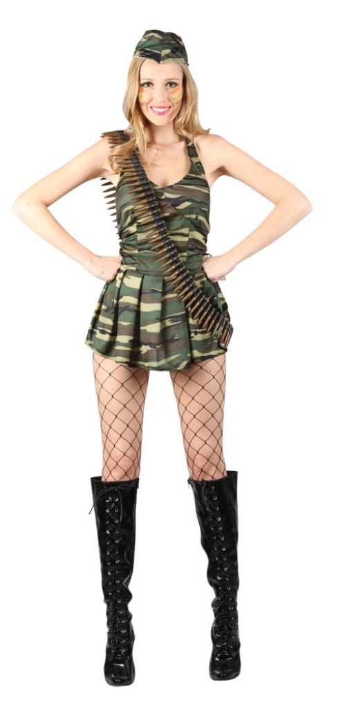 Ladies Cute Cadet Costume includes a green camouflage halter neck dress with a pleated skirt and a matching hat.