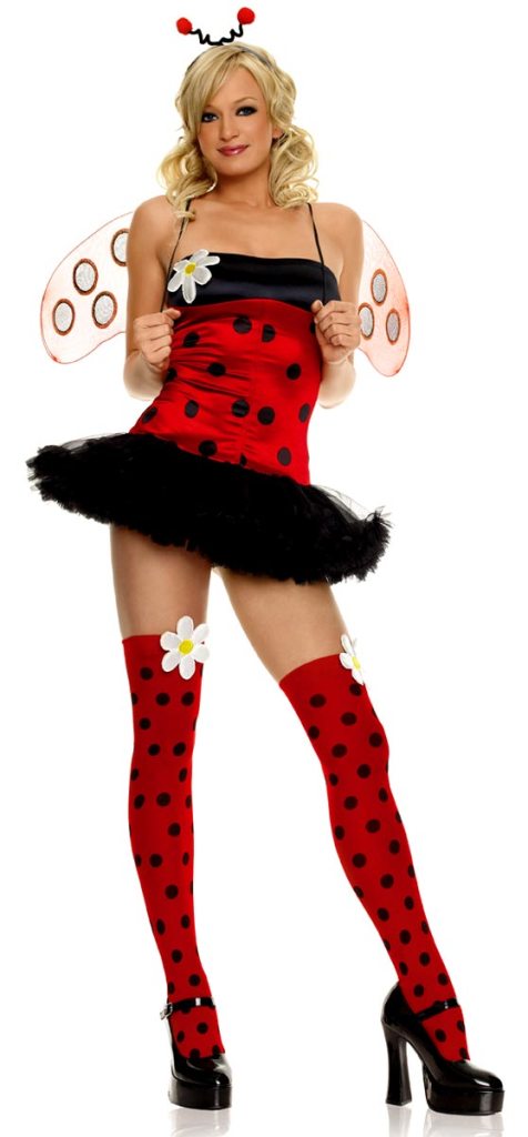 Four piece Leg Avenue Daisy Bug costume includes a short red and black petticoat dress with sunflower applique. Also included in this cute costume is pair of lady bug wings and a headpiece.