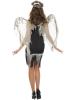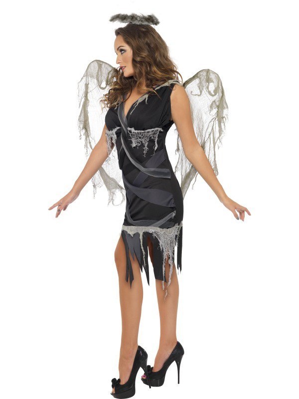 Dark fallen angel ladies costume includes a black sleeveless dress the dress features a shredded effect throughout. To complete this look a pair of distressed angel wings are included.