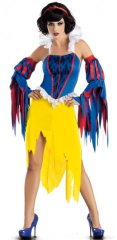 Dark Forest Princess costume includes a dress with a lace applique collar with matching waistline dress and elastic double jagged arm sleeves. The dress features a blue and red corset style top with black lace detailing and a yellow skirt with jagged ends.