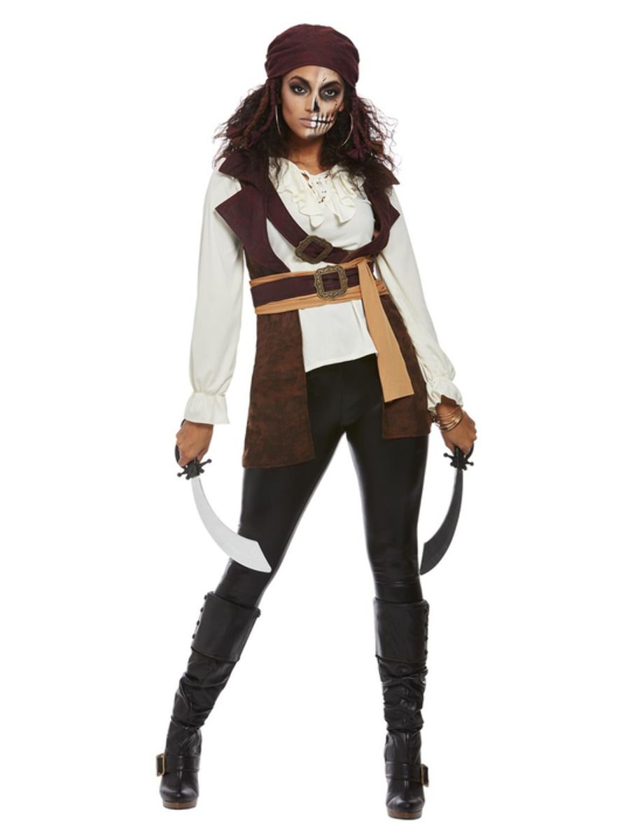 This Dark Spirit Pirate Costume includes a briwn top and hat.
