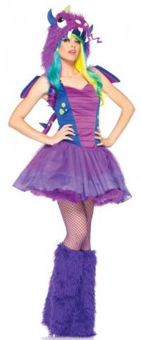 Darling Dragon Costume includes a a cute blue and purple dress with green dots and an attached purple Dragon tail. The Dress also features a tutu style skirt and an attached Dragon headpiece.
