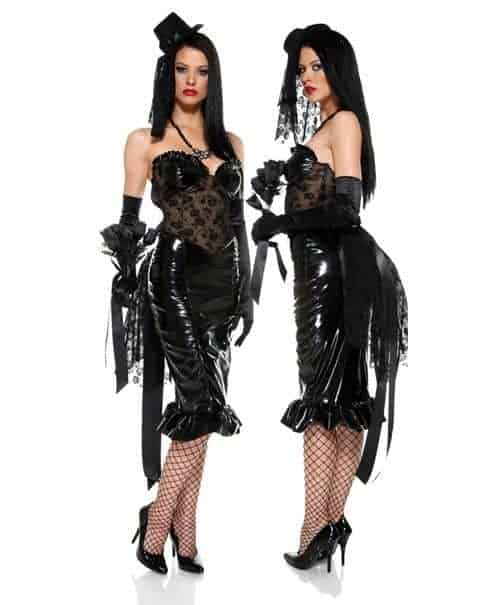 Be a Darque Bride with this Gothic wedding dress costume set. The wedding dress has a PVC bust, sparkly floral lace body and PVC skirt. Snuggly fits to give sleek outline.