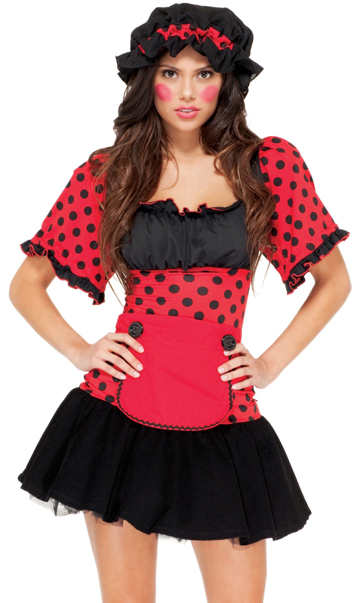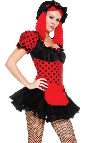This stunning rag doll ladies costume includes a minidress with red polka-dotted puff sleeves and bodice with a black bust and skirt. A matching button-detail apron, ruffled bonnet, and red yarn wig tie the sexy doll girl costume together.