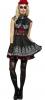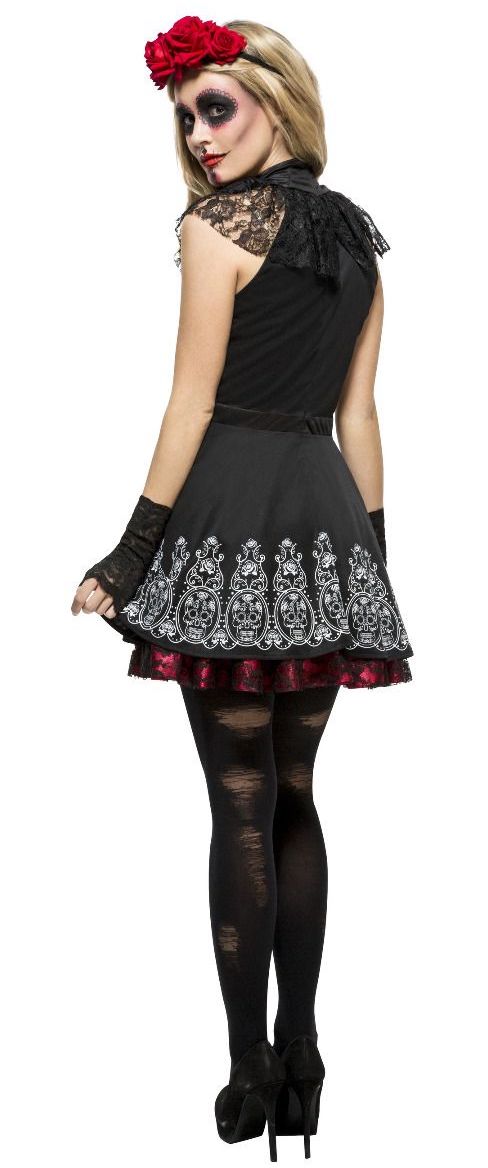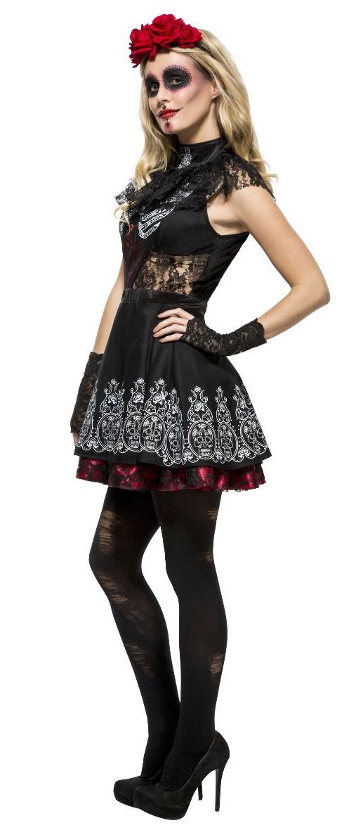 Day Of The Dead costume includes a dress with lace detail on the top, printed rib cage and an attached underskirt. Costume also includes a rode headband.