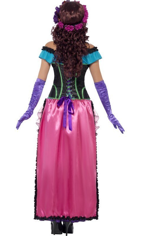 Day Of The Dead Sugar Skull costume includes a dress with colourful train and a lace up printed corset. Costume also includes a glitter eyemask with flower detail.