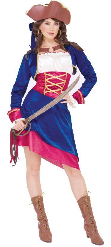 This stunning Deep Sea Jane Costume includes a one-piece elasticated waist strapy navy and maroon dip hem dress, gold lace-up corset with a ruffle neckline.