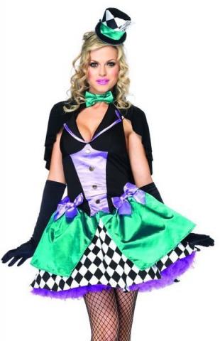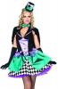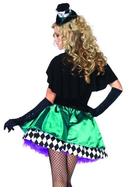Delightfully Mad Hatter costume includes a ribbon trimmed black and purple dress with a harlequinn style skirt and a teal satin feel overlay. The dress also features a low neck line and gold detailing along the front. To complete this cute look a black cape with bow closure and a matching mini hat on headband is also included.