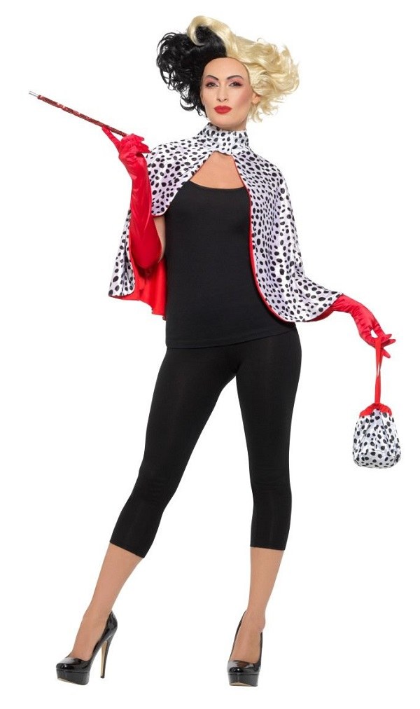 Deluxe Evil Madame Kit includes a black and white cape with a matching bag and a pair of red gloves.