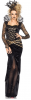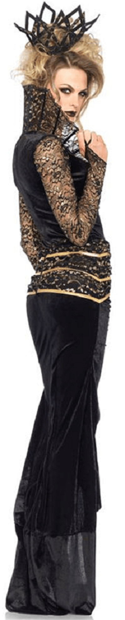 The Deluxe Evil Queen Costume includes a black and gold detailed full length dress with attached lace sleeves also with gold detailing. Also attached to the dress is a free standing lace collar.