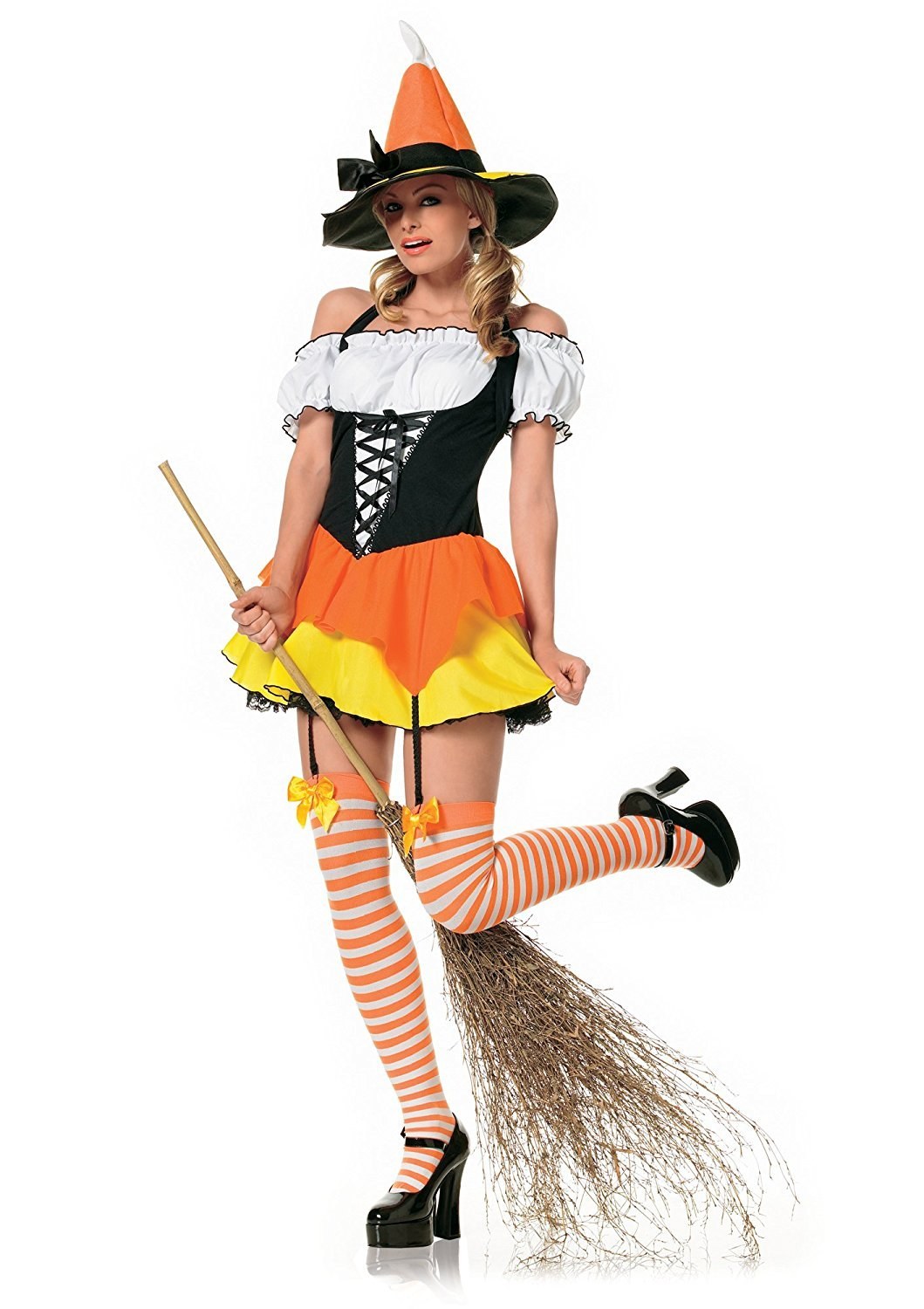 To complete the look a witches hat and a pair of orange and white thigh high stockings with yellow bow are also included.