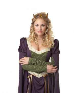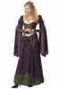 Deluxe Lady In Waiting costume includes a floor length corset style green and purple dress. The dress features long flowing sleeves and sweetheart neckline with a white lace trim and ribbon detailing on the skirt. This elegant costume also includes a faux green underskirt and a gold crown with gold jewels.