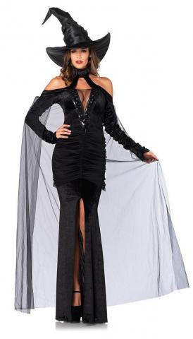 Sultry Sorceress costume includes along black dress with off the shoulder sleeves and a front slit. The dress also features black sequin detail and an attached sheer cape.