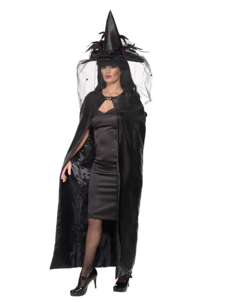 Long satin Deluxe Witches Cape in black with jewel fastener.
