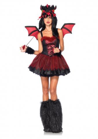 Swoop in and set the party on fire with this cute dragons costume. Deluxe 4 Piece Demon Dragon costume includes petticoat dress, velcro wings, arm piece and dragon hood.