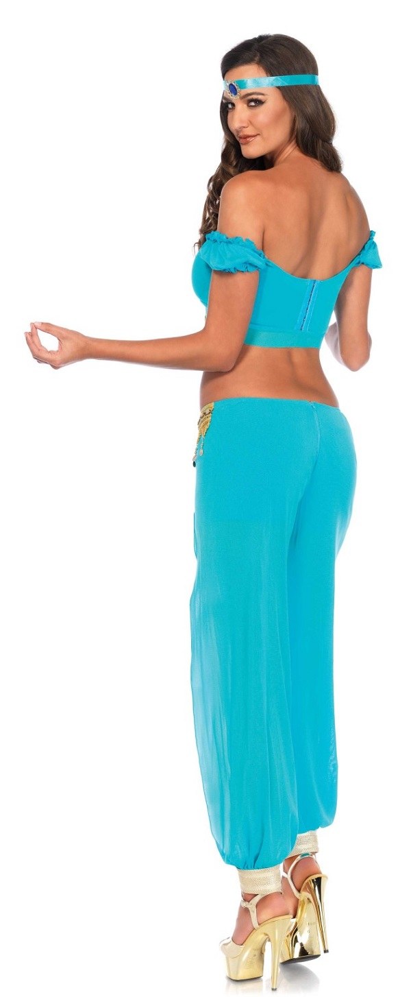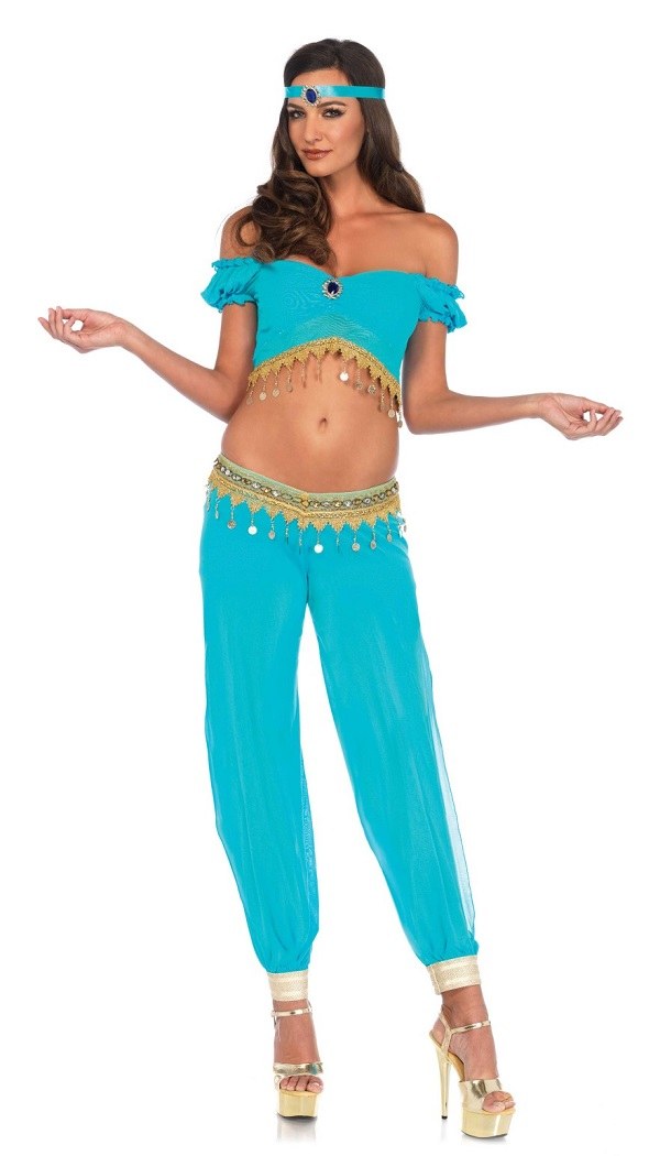 Desert Beauty Costume includes a coin trimmed off the shoulder crop top with three row hook and eye closure. Costume also includes a pair of harem pants with zipper back with elastic cuffs.