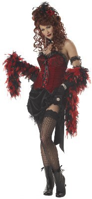 The Diamond Lil costume includes dark red bustier top with black lacing detail and lace trim, ruffled black skirt and bustle bow and to complete the look is a rose and feather headpiece.