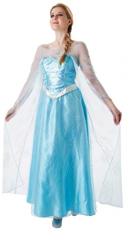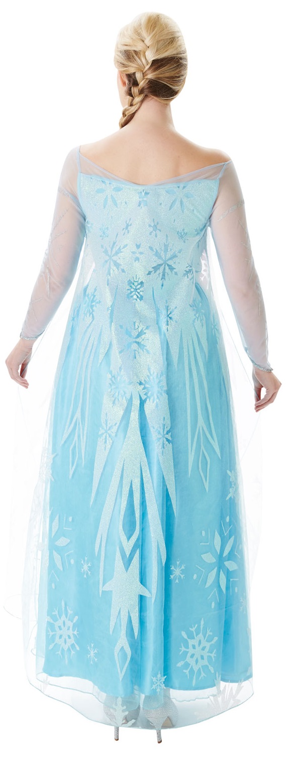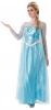From the hit Disney movie Frozen comes our Elsa costume. Included in this costume is a floor length blue dress with mesh sleeves and neckline and silver glitter and sequin detailing.