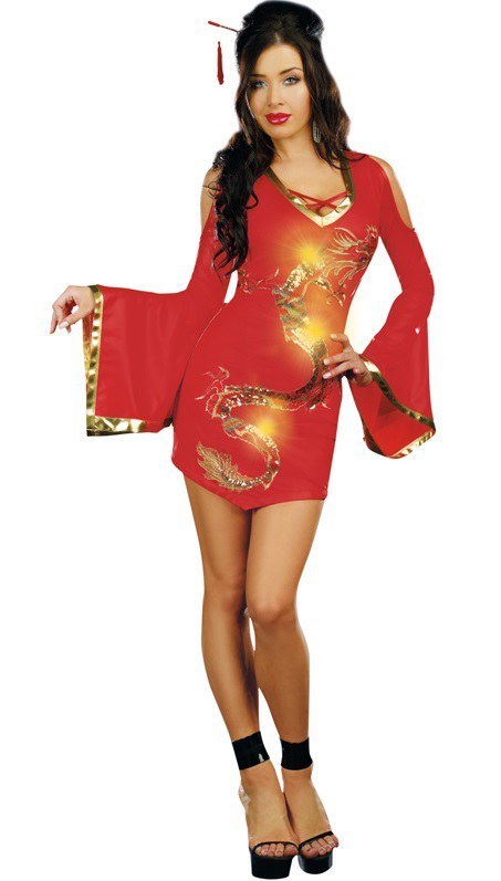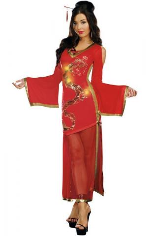 Dragon Mistress costume includes a convertible dress with snaps along the skirt hemline which can be removed and worn as a cape. Also included is a chopstick hair piece.