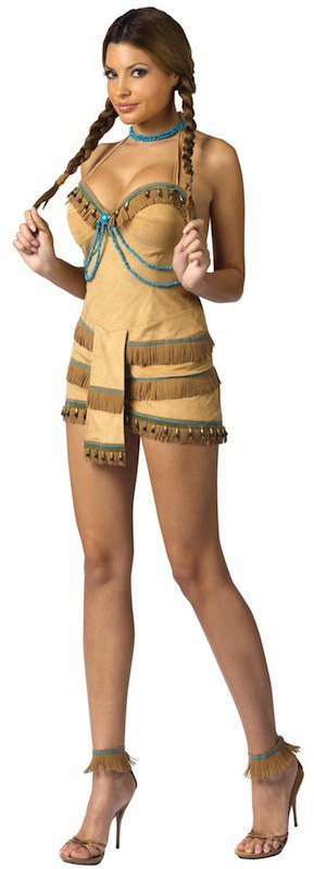 The native American style Dream Catcher Costume is a sexy, fringed, faux suede halter dress with turquoise and golden bead trim and an open back. Please note this is a very short costume