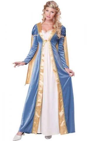 Ladies Elegant Empress Costume includes a long, pale blue and white, faux velour dress with gold trim and an attached gold cape.