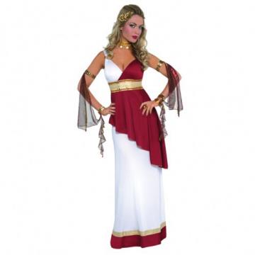 This elegant costumes comes with a white empire waistline toga style dress, the main dress is white with maroon layer cut at an angle just below the hip, a gold belt highlights the waistline with a maroon trim on the bottom of the dress.