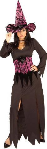 Elegant Witch costume includes a long black dress with jagged ends and a pink and a black corset. To complete the look a witch hat is also included.