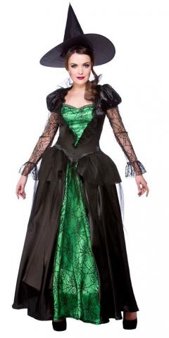 Emerald Witch costume includes a long dress with see through sleeves and a hooped petticoat. To complete the look a hat is also included.